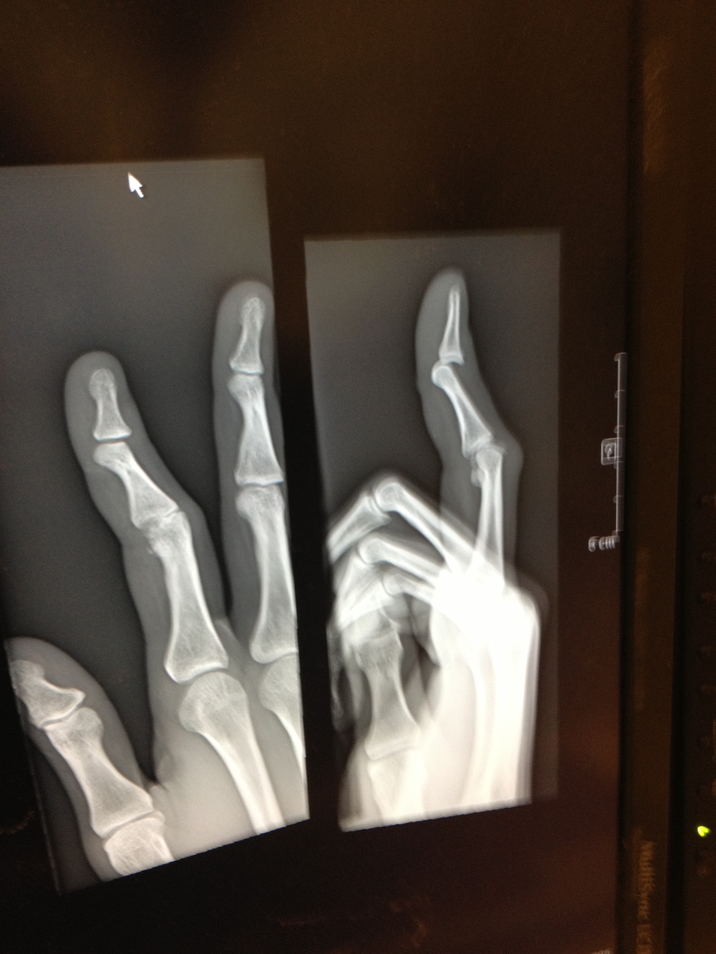 I think the long term outlook is that the move will be better for my health. Except for two things: One, public transportation here is a joke, so I now drive pretty much daily. I don’t have an actuarial table handy but that can’t increase life expectancy. And, two, I broke my right, index finger playing softball in mid-May. (That’s an X-ray of the dislocation and fracture above.) The bone and tendon have healed, but I’m still having trouble restoring the full range of motion to my finger. In my nine years of living in New York, I don’t think I ever saw the inside of an emergency room. I was in one within two months of moving here.